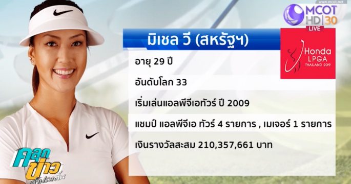 กอล์ฟฮอนด้า แอลพีจีเอ ไทยแลนด์ 2019 ระหว่างวันที่ 21-24 กุมภาพันธ์นี้ มีนักกอล์ฟหญิงระดับโลกเข้าร่วมดวลวงสวิง 70 คน ชิงเงินรางวัลรวมกว่า 53 ล้านบาท ซึ่งช่อง 9 MCOT HD หมายเลข 30 วันนี้เราจะพาไปรู้จัก “มิเชล วี” โปรสาวสวยจากสหรัฐ