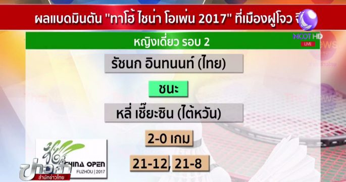 น้องเมย์ รัชนก อินทนนท์ นักแบดสาวมือ 1 ของไทย ผ่านเข้ารอบ 8 คนสุดท้ายไปพบกับ ไถ้ ซื่อหยิง มือ 1 ของโลก จากไต้หวัน ในแบดมินตันไชน่า โอเพ่น ที่จีน