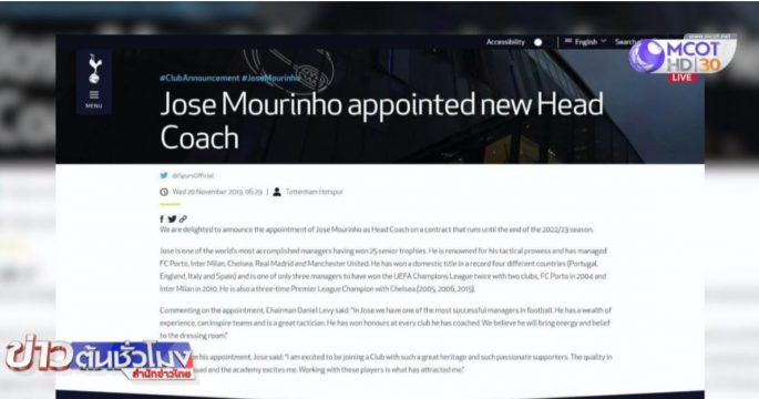 สโมสรท็อตแนม ฮอตสเปอร์ ประกาศแต่งตั้ง “มูรินโญ” เป็นผู้จัดการทีมคนใหม่อย่างเป็นทางการ สัญญา 3 ปีครึ่ง เจ้าตัวเผยตื่นเต้นได้ร่วมงาน