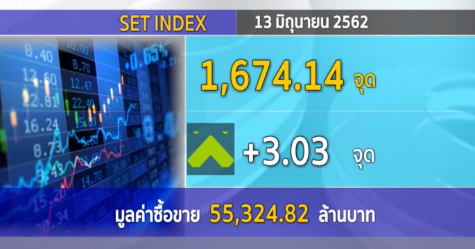 ดัชนีหุ้นไทยวันนี้ (13 มิ.ย.) ปิดบวกเล็กน้อย 3.03 จุด อยู่ที่ 1,674.14 จุด มูลค่าการซื้อขาย 55,324.82 ล้านบาท
