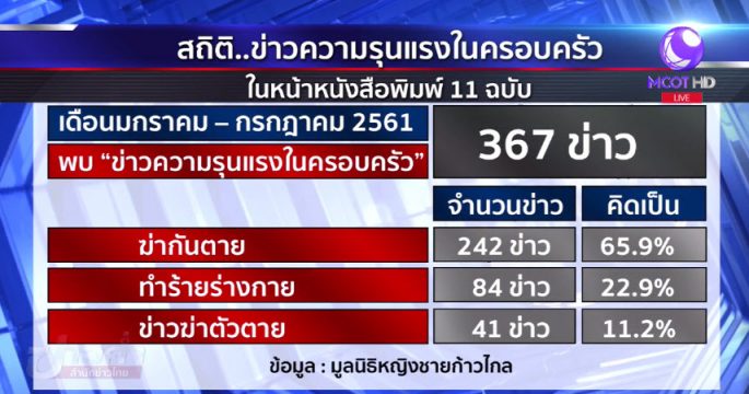 มูลนิธิหญิงชายก้าวไกล จับมือ สสส.เปิดสถิติความรุนแรงในครอบครัว พบว่าเพียง 7 เดือนแรกของปีนี้ มีข่าวฆ่ากันตาย ฆ่าตัวตาย และทำร้ายร่างกาย มากถึง 367 ข่าว