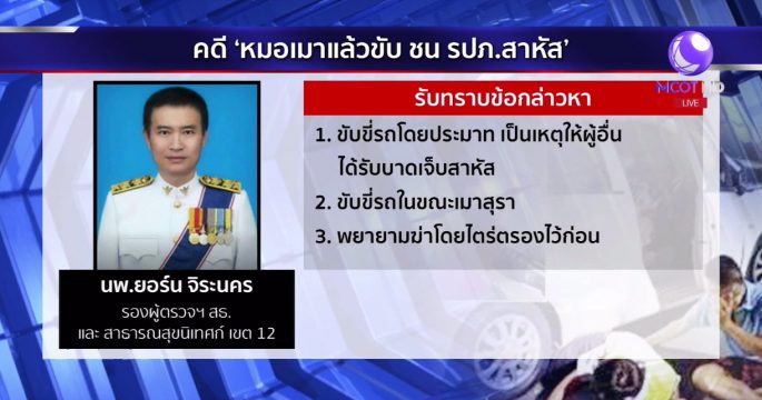 ส่วนความคืบหน้าด้านคดีความ “นพ.ยอร์น” แอบย่องเงียบเข้าพบพนักงานสอบสวน โดยถูกแจ้ง 3 ข้อหาหนัก ขณะที่เลขาธิการมูลนิธิเมาไม่ขับ เรียกร้องกระทรวงสาธารณสุขเอาผิดวินัยร้ายแรงกับ “นพ.ยอร์น”