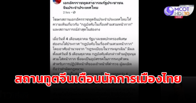 สถานเอกอัครราชทูตจีนประจำประเทศไทย โพสต์เฟซบุ๊กถึงสถานการณ์การเมืองและการชุมนุมที่ฮ่องกง ระบุมีนักการเมืองไทยบางคนติดต่อกับกลุ่มที่คิดจะแบ่งแยกฮ่องกงออกจากประเทศจีน โดยมีท่าทีเชิงสนับสนุน ชี้เป็นการกระทำที่ผิดอย่างร้ายแรงและไร้ความรับผิดชอบ
