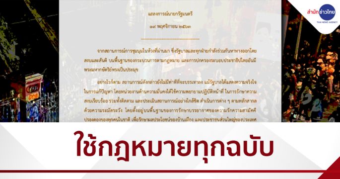 นายกรัฐมนตรี แถลงการณ์สถานการณ์ชุมนุมยังไม่มีท่าทีบรรเทาลง ระบุ จะบังคับใช้กฎหมายทุกฉบับต่อผู้ฝ่าฝืนให้สอดคล้องกับหลักสากล ย้ำ ที่ผ่านมารัฐบาลแสดงความจริงใจในการแก้ปัญหา