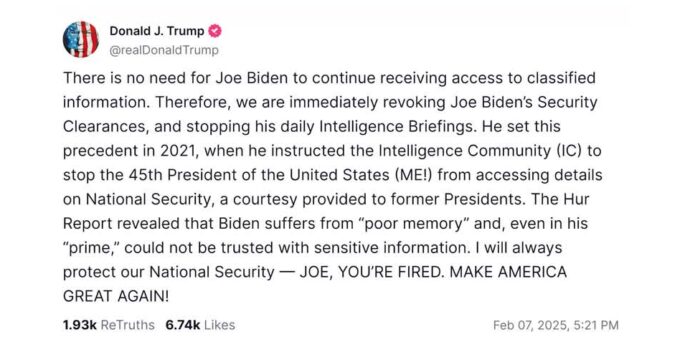 ประธานาธิบดีโดนัลด์ ทรัมป์ ของสหรัฐ กล่าววานนี้ว่า เขาเพิกถอนเพิกถอนสิทธิเข้าถึงข้อมูลชั้นความลับ (security clearances) ของอดีตประธานาธิบดีโจ ไบเดน