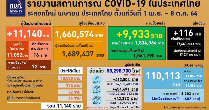 ศบค.เผยยอดติดเชื้อเพิ่ม 11,140 ราย เสียชีวิต 116 ราย อาการหนัก 3,003 ราย ใส่เครื่องช่วยหายใจ 682 ราย รักษาหายเพิ่ม 9,933 ราย ยันวัคซีน mRNA ไม่อันตรายตามที่มีกระแสในโซเชียล วอนอย่าหลงเชื่อ