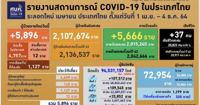 ศบค. รายงานพบผู้ติดเชื้อโควิด-19 รายใหม่ 5,896 ราย ATK 964 ราย เสียชีวิต 37 ราย