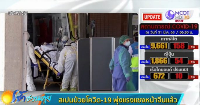 จำนวนผู้ป่วยโรคติดเชื้อไวรัสโคโรนา 2019 หรือโควิด-19 ในสเปน พุ่งขึ้นอย่างรวดเร็วเป็น 85,195 คน แซงหน้าจีนที่มีอยู่ 81,470 คนแล้ว แม้รัฐบาลสเปนจะใช้มาตรการปิดเมืองมานานถึง 2 สัปดาห์แล้วก็ตาม