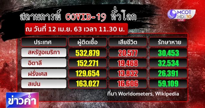 ยอดผู้เสียชีวิตจากโรคโควิด-19 ในหลายประเทศที่พบการระบาดรุนแรง เริ่มชะลอตัว ขณะที่สเปนพร้อมจะเปิดบางภาคส่วนของเศรษฐกิจให้กลับมาทำงานอีกครั้ง ส่วนที่จีนกลับพบผู้ติดเชื้อมากสุดในรอบเกือบ 6 สัปดาห์
