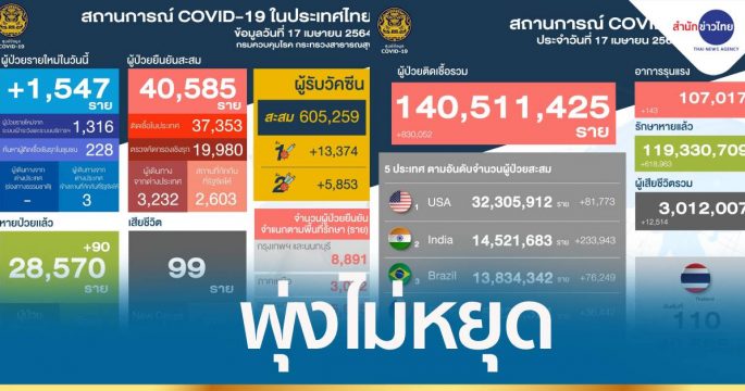 โฆษก ศบค.เผยยอดติดเชื้อพุ่งต่อเนื่อง ป่วยโควิดเพิ่มวันนี้ 1,547 ราย เสียชีวิตเพิ่ม 2 ราย
