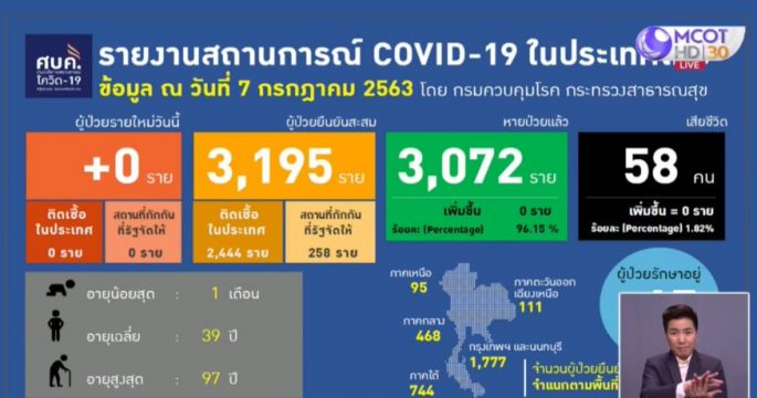ศบค. เผยสถานการณ์ผู้ป่วยโควิด-19 ประจำวัน วันนี้ (7 ก.ค.) ไม่พบผู้ป่วยใหม่เพิ่ม ทำให้ยอดผู้ป่วยสะสมยังอยู่ที่ 3,195 ราย ไม่พบผู้หายป่วยเพิ่ม ขณะที่ผู้เสียชีวิตยังอยู่ที่ 58 คน