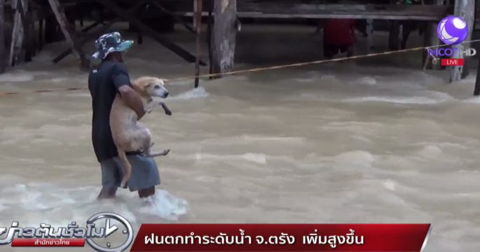 ฝนตก 2 วันติดต่อกัน ทำให้น้ำท่วมขยายวงกว้างทั้ง 7 อำเภอในจังหวัดตรัง ถนนเลี่ยงเมืองสายนานอน-นาขา น้ำท่วมระยะทางกว่า 1 กม. ชาวบ้านต้องขึงเชือกเพื่อไต่เข้าบ้านอยางทุลักทุเล