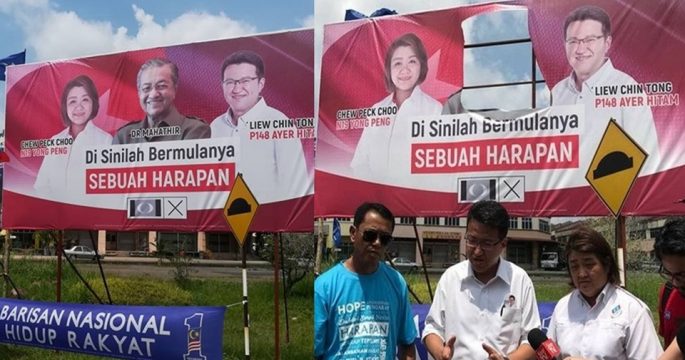 มาเลเซียตัดรูปหาเสียงของ ดร.มหาเธร์ โมฮัมหมัด แกนนำฝ่ายค้านออกจากป้ายโฆษณากลางแจ้งในรัฐยะโฮร์ โดยอ้างว่าไม่เป็นไปตามระเบียบใหม่เรื่องวัสดุที่ใช้ในการหาเสียง