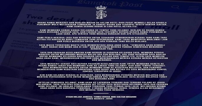 ยะโฮร์ บารู 4 ต.ค.- มกุฎราชกุมารรัฐยะโฮร์ของมาเลเซียเล่าประสบการณ์เหตุกราดยิงในห้างสรรพสินค้าใจกลางกรุงเทพฯ ของไทยผ่านสื่อสังคมออนไลน์ ตุนกู อิสมาอิล อิบนี สุลต่าน อิบราฮิม โพสต์แถลงการณ์ผ่านแพลตฟอร์มเอ็กซ์ (X) เมื่อค่ำวันที่ 3 ตุลาคมว่า พระองค์และครอบครัวกำลังนั่งอยู่ในล็อบบี้โรงแรมใกล้ห้างสรรพสินค้าในช่วงที่เกิดเหตุยิง ได้ยินคนกรีดร้องเสียงดังและเห็นคนวิ่งหนีจากห้างเข้ามาในโรงแรม พระองค์และพระชายารีบพาพระโอรสพระธิดาที่ยังเล็กวิ่งไปยังชั้นใต้ดินพร้อมกับทีมเจ้าหน้าที่อารักขา และปลอบโยนพระโอรสพระธิดาที่ร้องไห้ด้วยความตกใจ ทรงเป็นห่วงคนอื่น ๆ รวมถึงประเภทของอาวุธและสถานการณ์ที่เกิดขึ้น ตุนกู อิสมาอิล โพสต์ว่า ทรงแจ้งให้เจ้าหน้าที่พาไปยังสถานทูตมาเลเซีย แต่คนขับรถบอกว่าสถานทูตสิงคโปร์อยู่ใกล้กว่า จึงทรงติดต่อกงสุลใหญ่สิงคโปร์ในรัฐยะโฮร์ให้อำนวยความสะดวกเรื่องเข้าไปหลบภัยในสถานทูตสิงคโปร์ ทรงแจ้งเรื่องที่เกิดขึ้นกับนายกรัฐมนตรีและรัฐมนตรีกลาโหมมาเลเซีย โดยมีเอกอัครราชทูตมาเลเซียประจำประเทศไทยคอยอยู่ด้วย และเมื่อมั่นใจว่าทุกอย่างปลอดภัยก็จะเดินทางไปท่าอากาศยานเพื่อกลับรัฐยะโฮร์ พระองค์รู้สึกเสียใจที่ต้องพลาดชมการแข่งขันระหว่างสโมสรฟุตบอลยะโฮร์ ดารุล ทักซิม ของพระองค์ ที่จะแข่งกับสโมสรฟุตบอลบีจี ปทุม ยูไนเต็ดของไทยในวันเดียวกัน มกุฎราชกุมารรัฐยะโฮร์โพสต์ปิดท้ายว่า เป็นประสบการณ์เลวร้ายที่สุดที่พระองค์ทรงเคยประสบมา ทรงต้องปกป้องพระโอรสพระธิดาจากฆาตกร มีคนเสียชีวิต ขอให้พระเจ้าอำนวยพรให้แก่วิญญาณผู้บริสุทธิ์ และขอขอบคุณทีมเจ้าหน้าที่อารักขา เพื่อนในสิงคโปร์และมาเลเซียที่ให้ความช่วยเหลือ.-สำนักข่าวไทย