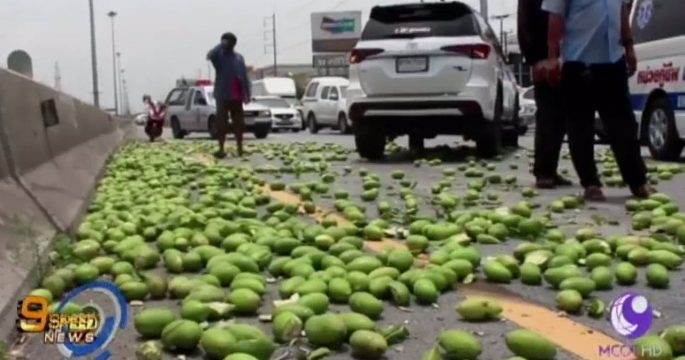 รถกระบะบรรทุกมะม่วงพลิกคว่ำบนถนนพหลโยธิน ขาเข้า อ.คลองหลวง จ.ปทุมธานี มะม่วงกระจายเต็มถนน และมีผู้โดยสารบาดเจ็บเล็กน้อย 1 คน