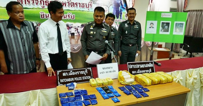 ราชบุรี 19 ก.ย.- ตำรวจราชบุรีรวบชาย วัย 34 ปี รับจ้างเฝ้ายาบ้า ยึดของกลางฝังดินใต้ต้นพุทรากว่า 60,000 เม็ด เจ้าตัวสารภาพเตรียมรอส่งลูกค้า พล.ต.ต.อานุภาพ ศรีนวล ผู้บังคับการตำรวจภูธรจังหวัดราชบุรี พร้อม พ.อ.มาโนชญ์ รัตนเลขา รอง ผบ.กองพลพัฒนาที่ 1 และนายรณภพ เวียงสิมมา นายอำเภอเมือง แถลงจับกุมนายกิตติ หรือตู่ เพชรนารถ อายุ 34 ปี ขณะขับรถจักรยานยนต์พยายามหลบหนีการจับกุมพร้อมของกลางยาบ้า 396 เม็ด จากนั้นได้ขยายผลตรวจค้นเพิงพักไม่มีเลขที่ หมู่ 5 ต.น้ำพุ อ.เมือง พบยาบ้าฝังไว้ใต้ต้นพุทราอีก 60,000 เม็ด รวมเป็น 63,196 เม็ด นายกิตติ ให้การว่า ยาบ้าทั้งหมดเป็นของญาติเตรียมส่งต่อให้ลูกค้า และมีหน้าที่เพียงดูแลยาบ้าไว้ตามค่าจ้าง เจ้าหน้าที่จึงดำเนินคดีในข้อหามียาเสพติดให้โทษประเภท 1 (ยาบ้า) ไว้ในครอบครองเพื่อจำหน่ายโดยผิดกฎหมาย.-สำนักข่าวไทย