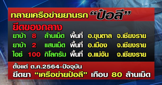 ตำรวจภาค 5 จับยาบ้ากว่า 8 ล้านเม็ด ไอซ์ 100 กก. โดยเฉพาะปีนี้จับยาบ้าเครือข่ายป๋อลี ได้มากกว่า 10 ครั้ง จำนวนกว่า 40 ล้านเม็ด พร้อมตั้งค่าหัวป๋อลี สูงถึง 1 ล้านบาท แต่ยังหลบหนีอยู่ตามแนวชายแดนในลาว และยังตั้งค่าหัวขบวนการค้ายาเสพติด 7 คน ที่ยิงสารวัตรสืบสวน สภ.ฝาง เสียชีวิต รายละ 2 แสนบาท