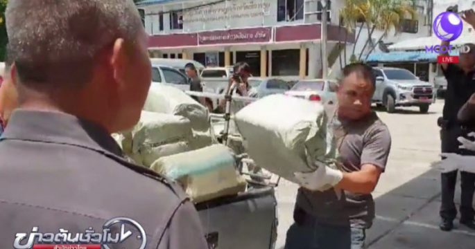 ตำรวจเชียงรายลำเลียงยาบ้าเกือบ 60 กระสอบ คาดมีมากกว่า 10 ล้านเม็ด ลงจากรถกระบะติดป้ายทะเบียนปลอม ซึ่งจอดทิ้งไว้ริมถนน อ.เวียงชัย จ.เชียงราย ช่วงสายวันนี้