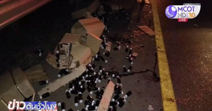 กระบะชนสิบล้อ ยาแก้ไอนับหมื่นขวดเกลื่อนถนน คาดขนลงใต้ ขายให้วัยรุ่นผสมน้ำกระท่อมสูตรสี่คูณร้อย