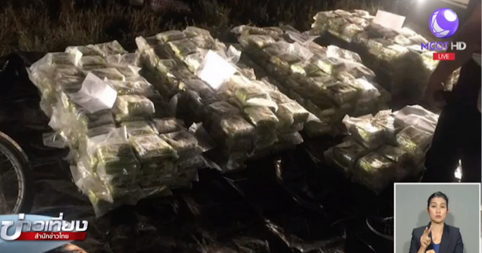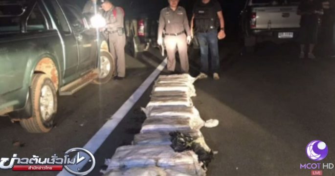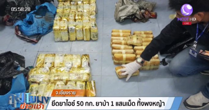 เจ้าหน้าที่ตรวจยึดยาบ้า 100,000 เม็ด และยาไอซ์ 50 กก. ใส่ถุงดำวางทิ้งพงหญ้าริมถนน อ.แม่สาย จ.เชียงราย