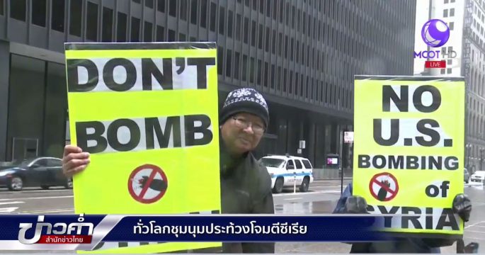 ผู้คนในหลายประเทศทั่วโลก รวมทั้งสหรัฐ รวมตัวประท้วงต่อต้านสหรัฐและชาติพันธมิตร ที่ยิงขีปนาวุธถล่มซีเรีย