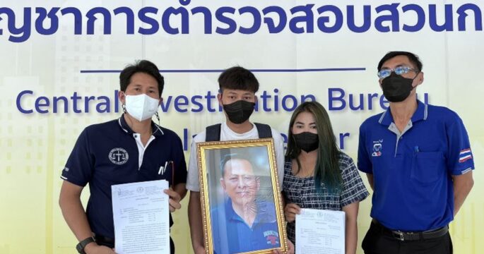 ร.ต.ชัชวาลย์ บำรุงวงศ์ กลุ่มทนายใจดี พา น.ส.ณรัฐภรณ์ ไทยกล้า บุตรของนายพยนต์ ไทยกล้า หรือลุงโก๋ ผู้ตาย นำหลักฐานจัดฉากฆาตกรรมมาร้องเรียน พล.ต.ท.จิรภพ ภูริเดช ผบช.ก. โดยมีพนักงานสอบสวน กก.4 บก.ป. เป็นผู้รับแทน