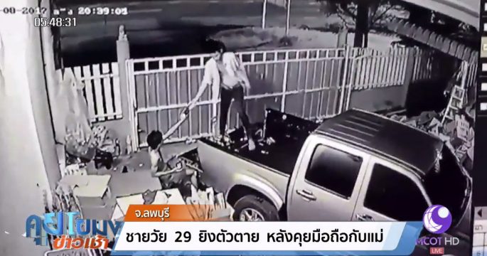 ภาพวงจรปิดจับภาพขณะพี่ชายกระโดดขึ้นรถกระบะ ยื่นโทรศัพท์ให้น้องคุยกับแม่ก่อนระเบิดกระสุนใส่ขมับตัวเองตายหลังรถกระบะหน้าบ้านลพบุรี