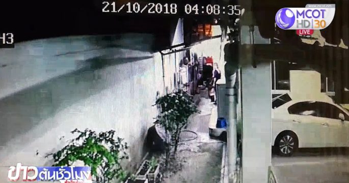 ภาพจากกล้องวงจรปิดของพานทองแมนชั่น จ.นนทบุรี จับภาพบริเวณห้องพัก รปภ.ด้านหลังอาคาร ถือปืนเดินเข้าไปยิงเพื่อนร่วมอาชีพเสียชีวิต ก่อนยิงตัวตายหนีความผิด