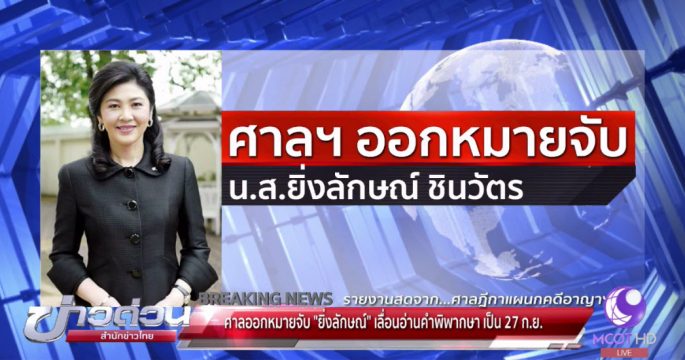 ศาลฎีกาฯ เลื่อนอ่านคำพิพากษาคดีจำนำข้าว เนื่องจาก “ยิ่งลักษณ์” จำเลย ไม่มาศาล โดยอ้างเหตุผลมีอาการน้ำในหูไม่เท่ากัน ซึ่งศาลพิเคราะห์แล้วว่าไม่สมเหตุผล จึงอนุมัติหมายจับ “ยิ่งลักษณ์” และเลื่อนการอ่านคำพิพากษาเป็น 27 ก.ย.60