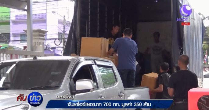 ตำรวจปราบปรามยาเสพติด ตรวจยึดไอซ์ล็อตใหญ่ 700 กิโลกรัม มูลค่า 350 ล้านบาท ขณะขนมาเก็บไว้ในหาดใหญ่ เตรียมส่งไปมาเลเซีย เจ้าหน้าที่เร่งมือขนขึ้นรถบรรทุกส่งมายังกรุงเทพฯ เพื่อให้ผู้บังคับบัญชา แถลงข่าวเร็วๆ นี้