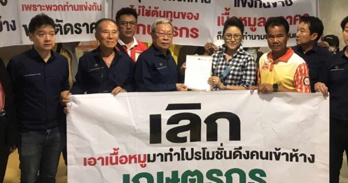 สมาคมผู้เลี้ยงสุกรแห่งชาติ ยื่นข้อเรียกร้องห้างค้าปลีกค้าส่ง จัดระเบียบตั้งราคาขายไม่กระทบเกษตรกร พร้อมระบุการขายหมูแบบดั๊มพ์ราคาแข่งกันของห้างดังจะทำให้เกษตรกรอยู่ไม่ได้และต้องเลิกกิจการ โดยราคาที่เกษตรกรอยู่ได้จะอยู่ที่ราคา 120 บาทขึ้นไป แต่ห้างดังขายกิโลกรัมละ 102-103 บาท