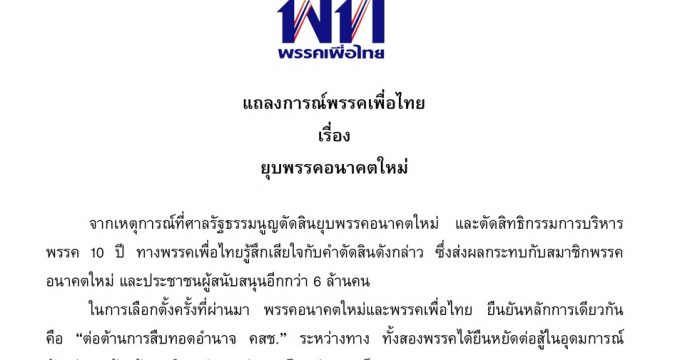 เพื่อไทยออกแถลงการณ์ เสียใจอนาคตใหม่ถูกยุบ ให้กำลังใจส.ส.พร้อมเดินหน้าทำงานตามอุดมการณ์
