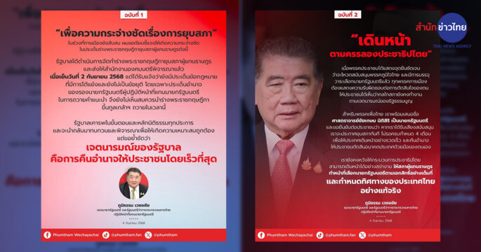 กทม. 4 ก.ย.- “ภูมิธรรม” โพสต์ข้อความชี้แจง 2 ฉบับ “เพื่อความกระจ่างชัดเรื่องการยุบสภา – เดินหน้าตามครรลองประชาธิปไตย” นายภูมิธรรม เวชยชัย รองนายกรัฐมนตรีและรัฐมนตรีว่าการกระทรวงมหาดไทย ปฏิบัติหน้าที่แทนนายกรัฐมนตรี โพสต์เฟซบุ๊กชี้แจง 2 ฉบับ “เพื่อความกระจ่างชัดเรื่องการยุบสภา – เดินหน้าตามครรลองประชาธิปไตย” โดยฉบับที่ 1 ระบุว่า “เพื่อความกระจ่างชัดเรื่องการยุบสภา” ในช่วงที่การเมืองยังสับสน ผมขอเรียนชี้แจงให้เกิดความกระจ่างชัดในประเด็นร่างพระราชกฤษฎีกายุบสภาผู้แทนราษฎรดังนี้ รัฐบาลได้ดำเนินการจัดทำร่างพระราชกฤษฎีกายุบสภาผู้แทนราษฎร และส่งให้สำนักงานองคมนตรีพิจารณาแล้วเมื่อเย็นวันที่ 2 กันยายน 2568 ต่อมาได้รับแจ้งจากสำนักงานองคมนตรี ว่ายังมีประเด็นข้อกฎหมายที่มีการโต้แย้งและยังไม่เป็นข้อยุติ โดยเฉพาะประเด็นอำนาจของรองนายกรัฐมนตรีผู้ปฏิบัติหน้าที่แทนนายกรัฐมนตรีในการถวายคำแนะนำ จึงยังไม่เห็นสมควรนำร่างพระราชกฤษฎีกาขึ้นทูลเกล้าฯ ถวายในเวลานี้ รัฐบาลเคารพในขั้นตอนและหลักนิติธรรมทุกประการ และจะนำกลับมาทบทวนและพิจารณาเพื่อให้เกิดความเหมาะสมถูกต้อง แต่ขอย้ำชัดว่า เจตนารมณ์ของรัฐบาลคือการคืนอำนาจให้ประชาชนโดยเร็วที่สุด จากนั้นได้โพสต์ ฉบับที่ 2 “เดินหน้าตามครรลองประชาธิปไตย” ระบุ เมื่อพรรคประชาชนได้แสดงจุดยืนชัดเจนว่าจะโหวตสนับสนุนพรรคภูมิใจไทย และมีการบรรจุวาระเลือกนายกรัฐมนตรีแล้ว ทุกพรรคการเมืองต้องแสดงความรับผิดชอบต่อการตัดสินใจของตน ให้ประชาชนได้เห็นว่ากลไกสภายังคงทำงานตามเจตนารมณ์ของรัฐธรรมนูญ สำหรับพรรคเพื่อไทย เราพร้อมเสนอชื่อศาสตราจารย์ชัยเกษม นิติสิริ เป็นนายกรัฐมนตรี และขอยืนยันต่อประชาชนว่า หากเราได้รับเสียงสนับสนุน […]