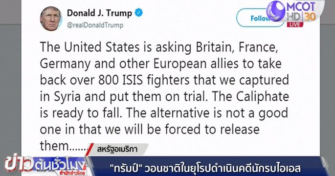 ประธานาธิบดีโดนัลด์ ทรัมป์กล่าวว่า สหรัฐได้ขอให้ประเทศพันธมิตรยุโรปรับตัวนักรบกลุ่มไอเอสกว่า 800 คนที่ถูกจับได้ในซีเรียกลับไปดำเนินคดี