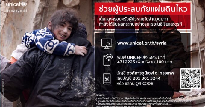 ยูนิเซฟ ประเทศไทย ระดมความช่วยเหลือแผ่นดินไหวตุรกี-ซีเรีย