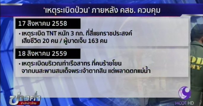 ภายหลังการเข้าควบคุมอำนาจการปกครองของคณะรักษาความสงบแห่งชาติ หรือ คสช. ตั้งแต่วันที่ 22 พฤษภาคม 2557 เป็นวันครบรอบ 3 ปีในวันนี้ เกิดเหตุระเบิดป่วนหลายครั้ง