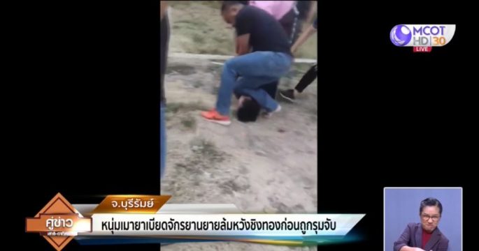 หนุ่มเมายาขี่รถมอเตอร์ไซค์เบียดจักรยานยายวัย 62 ปี จนล้ม ก่อนขู่ให้ถอดสร้อยทองให้ แต่ยายตะโกนให้คนช่วย คนร้ายจึงขับรถหนี รถเสียหลักล้ม โดนผู้ใหญ่บ้านและชาวบ้านตามล็อกตัวได้สำเร็จ