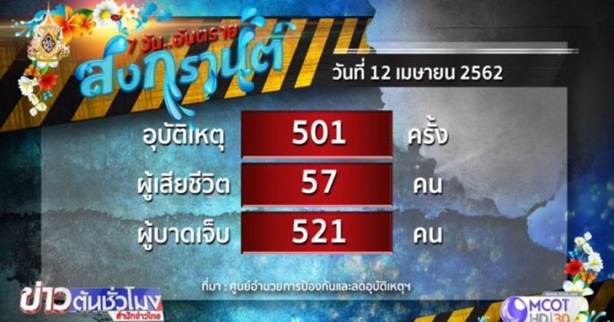 ศปถ. เผยสถิติการเกิดอุบัติเหตุวันที่ 12 เม.ย. วันที่ 2 ของการรณรงค์ช่วงเทศกาลสงกรานต์ มีทั้งสิ้น 501 ครั้ง ส่งผลให้ยอดอุบัติเหตุสะสม 2 วัน อยู่ที่ 969 ครั้ง