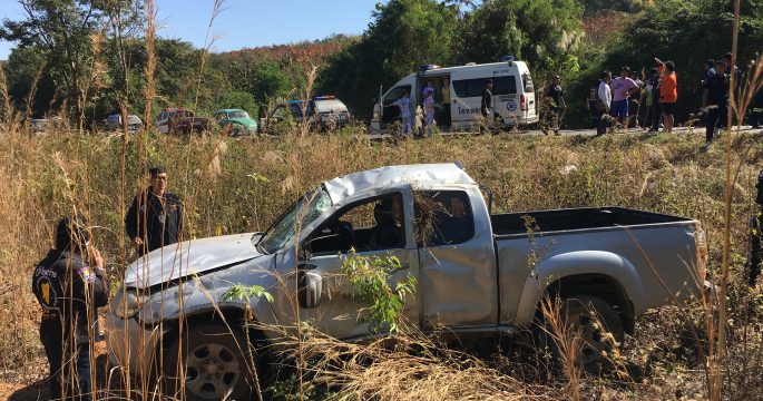 รถกระบะพาแรงงานชาวลาวไปส่งด่านพุ่งตกข้างถนนเมืองเลยดับ 1 เจ็บ 5