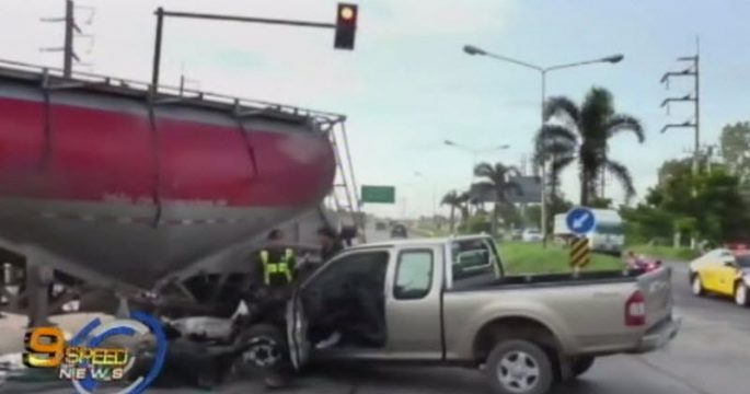 เกิดเหตุรถกระบะชนกับรถบรรทุกปูนที่ จ.ฉะเชิงเทรา ทำให้รถกระบะพังยับเยิน ส่วนคนขับรถกระบะและภรรยาได้รับบาดเจ็บ