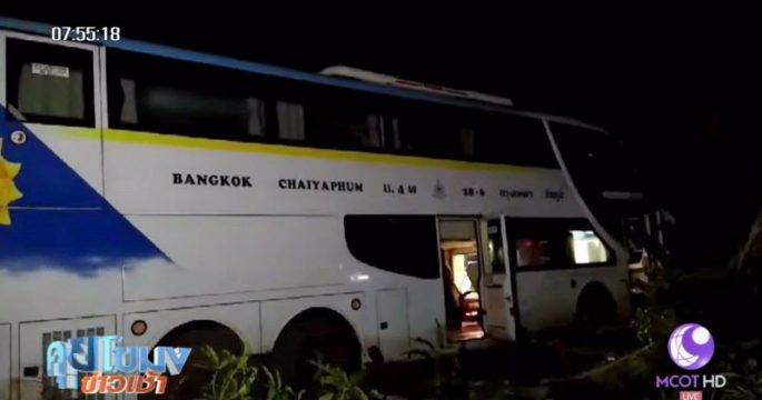 เกิดอุบัติเหตุรถทัวร์กรุงเทพฯ-ชัยภูมิ หักหลบรถกระบะที่ขับปาดหน้ากะทันหัน ทำให้เสียหลักพุ่งตกลงข้างทางที่ จ.ชัยภูมิ มีผู้บาดเจ็บ 13 คน