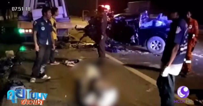 รถกระบะวูบหลับเสียหลักชนท้ายรถพ่วง 18 ล้อ ที่จอดอยู่ข้างทาง บนถนนมอเตอร์เวย์ อ.บางปะกง จ.ฉะเชิงเทรา มีผู้เสียชีวิต 1 ราย บาดเจ็บ 2 ราย