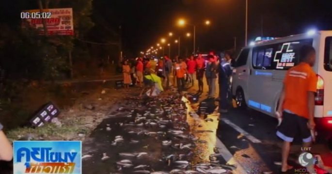 รถกระบะบรรทุกพริกชนท้ายรถกระบะบรรทุกปลา บริเวณถนนศรีสะเกษ-ขุขันธ์ เสียหลักตกร่องน้ำข้างทาง ส่วนรถบรรทุกปลาพุ่งเข้าบ้านข้างทาง ภรรยาเจ้าของบ้านบาดเจ็บ