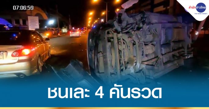 ที่ จ.ฉะเชิงเทรา เกิดอุบัติเหตุรถกระบะพุ่งข้ามเกาะกลางถนนชนเข้ากับรถเก๋งและรถกระบะอีกเลน ก่อนจะพุ่งชนป้ายและเสาไฟ พลิกคว่ำอยู่กลางถนน เสียหายรวม 4 คัน ส่วนคนขับยังนั่งมึนงงอยู่ในรถของตัวเอง