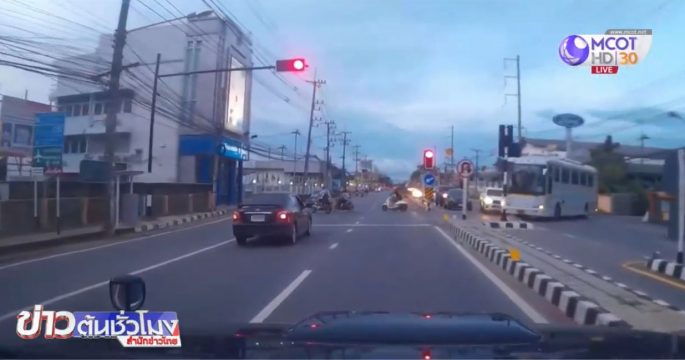 เปิดภาพนาทีระทึก รถทัวร์กลับรถตัดหน้ากระบะ ทำให้ชนกันอย่างจัง รถทัวร์เสียหลักพุ่งขึ้นเกาะกลางข้ามฝั่งไปชนกับรถยนต์ที่จอดติดไฟแดงฝั่งตรงข้ามได้รับความเสียหาย