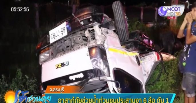 รถกระบะอาสากู้ภัยสระบุรีกลับจากช่วยน้ำท่วมภาคอีสาน ชนประสานงารถบรรทุก 6 ล้อ จนท.กู้ภัยเสียชีวิตติดภายในรถ 1 คน บาดเจ็บ 1 คน