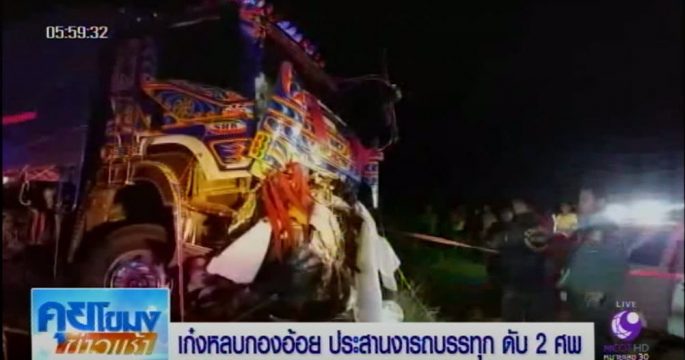 รถเก๋งหลบกองอ้อยริมถนน เสียหลักประสานงารถบรรทุกพ่วงอย่างจังจนรถขาดสองท่อน ตายสยอง 2 ศพ