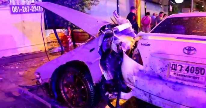 เก๋งเสียหลักพุ่งอัดเสาไฟขาด 2 ท่อนคนขับกระเด็นดับนอกรถ