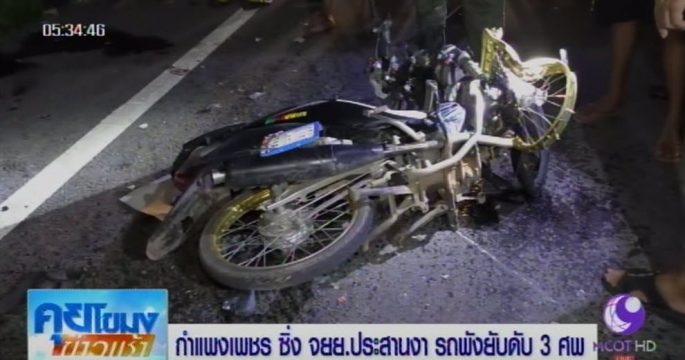 รถจักรยานยนต์ชนประสานงากันบนถนนสายปากอ่าง-คลองลาน อ.เมือง จ.กำแพงเพชร สภาพรถทั้ง 2 คันพังยับ เสียชีวิตคาถนนทันที 3 ราย