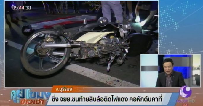 เกิดเหตุสลดหนุ่มวัย 26 ปี ขับขี่รถจักรยานยนต์มาด้วยความเร็ว พุ่งชนท้ายรถสิบล้อบรรทุกเงาะเต็มคัน ขณะจอดติดไฟแดง จนหมวกกันน็อกแตกกระจาย คอหักเสียชีวิตคาที่